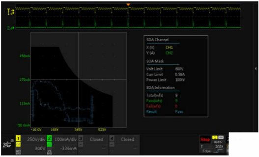 示波器的測試應用非常簡單,使用電壓、電流探頭正常測試開關管的VDS和IDM,并打開SOA分析功能,對照數據手冊的SOA數據設置好示波器的SOA參數即可。一但波形觸碰到安全區以外的區域,就說明器件超額工作,存在危險。
